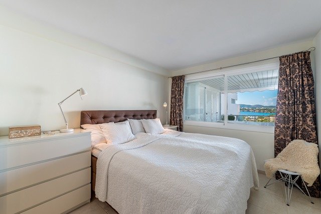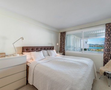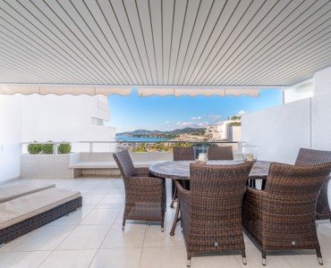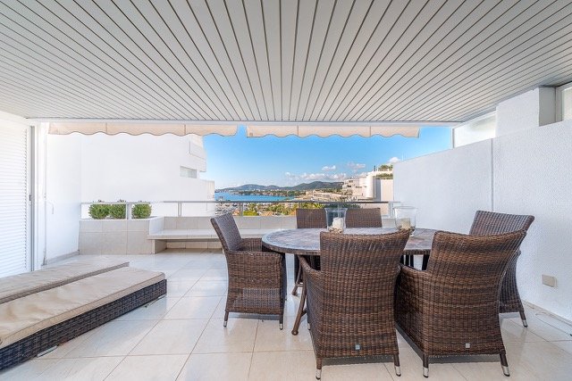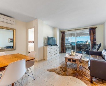 Beautiful apartment located in the popular community of Las Terrazas with direct acces to the marina and the beach of Puerto Portals. The property comprises 2 double bedrooms, 2 bathrooms (1 ensuite), American style kitchen and a bright lounge/dining room with direct access to a large 25 m2 sunny terrace with fantastic marina and sea views.The complex offers community pool, garden and parking.
