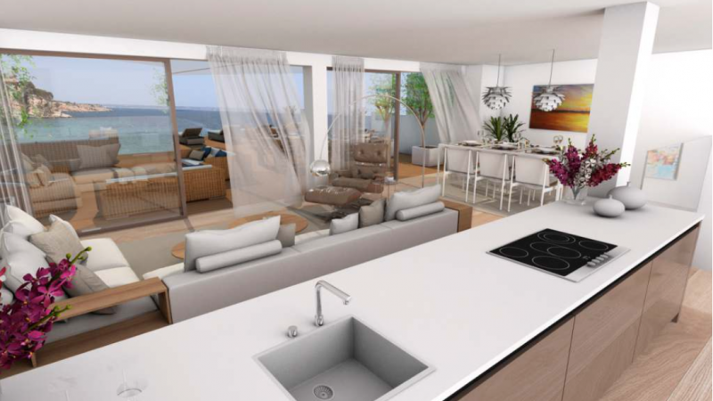 Brand new luxury apartment with unique frontline location. Construction will be finished in June 2017. This high quality and modern property with direct sea access will offer; 2 double bedrooms, 2 bathrooms, guest WC, open plan lounge/dining room leading to a 24m2 terrace with fantastic sea views. Extras; Domotic system, community swimming pool, garden, sauna and parking.